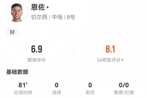 体育资讯6月29日讯 切尔西在本届世俱杯1-0领先本菲卡,恩佐本场数据如下: