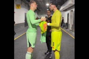 体育资讯6月30日讯 拜仁在世俱杯16强战4-2淘汰弗拉门戈,诺伊尔和对方门将奥古斯汀-罗西在赛后交换了球衣。