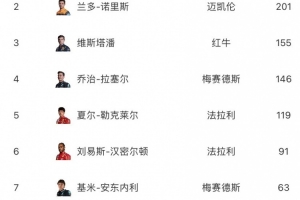 本站过后,皮亚斯特里216分领跑车手积分榜,诺里斯201分第二,维斯塔潘155分第三,拉塞尔、勒克莱尔、汉密尔顿分列4-6名。