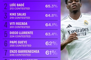 24/25赛季西甲对抗200+次球员成功率排名:琼阿梅尼65.4%居首