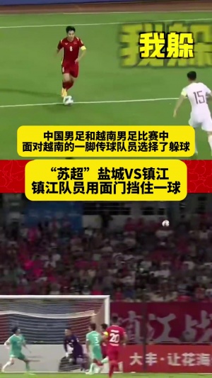 原视频中,一个画面是吴曦在对阵越南时的“躲球”镜头,另一个是镇江球员用面门挡球的画面。