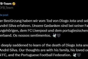 德国足协官推写道:“我们怀着巨大的震惊获悉迪奥戈-若塔及其兄弟安德烈-席尔瓦离世的消息。我们的心与其家人、亲友、利物浦足球俱乐部以及葡萄牙足协同在。🕊️🖤”