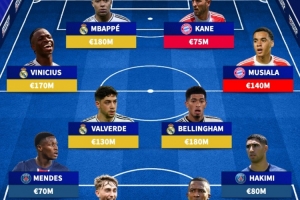 中场:维尼修斯(皇马,1.7亿)、巴尔韦德(皇马,1.3亿)、贝林厄姆(皇马,1.8亿)、穆西亚拉(拜仁,1.4亿)
