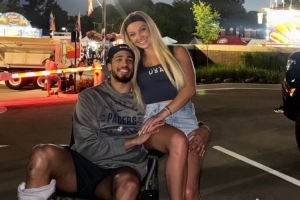 体育资讯7月5日讯 当地时间7月4日是美国独立日,哈利伯顿和女友Jade在室外观看烟花秀庆祝节日。