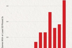 2014-15赛季,NBA一共只有3场比赛双方合计投丢至少50个三分。本赛季至今,这一数据是451场。