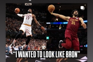 体育资讯4月3日讯 今日骑士中锋阿伦在接受媒体采访谈到自己的滑翔暴扣时表示:“我想扣得像老詹一样,但我看了回放,我差得老远了。”