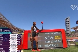 切贝特最后200米跑出惊人冲刺,最终飙出13分58秒06,一口气将策盖保持的世界纪录提高了2秒多,也成为史上第一位跑进14分钟的女选手。