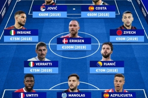 中场:维拉蒂(7500万欧)、皮亚尼奇(7000万欧)、因西涅(7500万欧)、埃里克森(1亿欧)、齐耶赫(5000万欧)