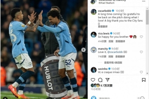 赛后鲍勃在社交媒体上晒出自己出场时的照片,并配文:“等待已久!非常感激能够重返球场,做我喜欢的事情!衷心感谢曼城球迷。”