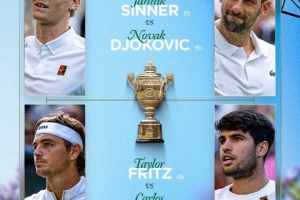 温网男单四强全部产生,分别为:阿尔卡拉斯、辛纳、弗里茨、德约科维奇。