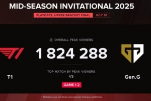 体育资讯7月10日讯 外媒数据统计媒体发布2025季中冠军赛T1对阵GEN第二局观众峰值数据,本局比赛观众峰值达到了1824288。
