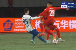 泰山vs梅州第60分钟,钟浩然跳起抢断,鞋底踩着彭欣力膝盖起飞!但是裁判没有响哨!VAR介入,裁判看过回放后,将其直红罚下!