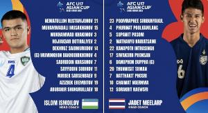 乌兹别克斯坦U17首发:21-鲁斯塔姆佐诺夫、2-博蒂拉列夫、3-哈基莫夫、4-巴霍迪尔霍诺夫、14-赛迪穆罗多夫、15-穆萨霍诺夫、18-舒库鲁拉耶夫、7-哈萨诺夫、11-索迪科夫、19-叶列姆别托夫、9-萨尔森巴耶夫