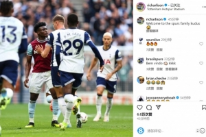 热刺前锋理查利森更新社媒动态,晒出库杜斯与热刺球员在球场上发生冲突的照片,配文:“欢迎加入热刺大家庭,库杜斯😅”