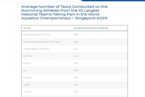 在游泳选手人数最多的10支队伍中,中国队人均接受检查8.8次,其中男子短距离自由泳选手王浩宇13次,覃海洋和杨佩琪各12次,柳雅欣、彭旭玮和孙佳俊各11次。接受检查次数第二多的是中立运动员(俄罗斯),人均8.2次。美国队和澳大利亚队分别是4.13次和4次。此后的排位依次是法国、意大利、匈牙利、日本、加拿大和英国队。