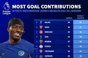 德转列马杜埃凯加盟蓝军后英超边锋同期直接参与进球榜: