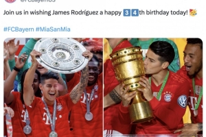 体育资讯7月12日讯 今天是前拜仁中场J罗的34岁生日,拜仁官方发文为哥伦比亚人送上祝福。