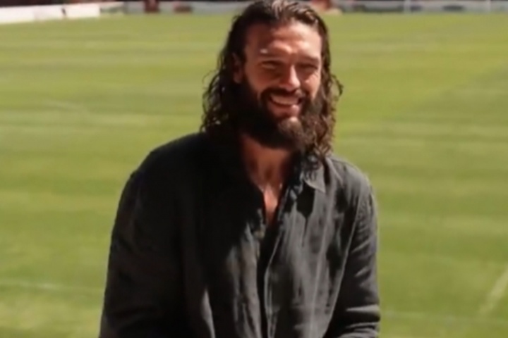 在官宣中,安迪-卡罗尔没有用标志性的小辫子造型,而是披肩长发,还留着大胡子。