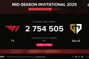 体育资讯7月13日讯 外媒Esports Charts发布T1对战GEN前三局海外峰值突破此前纪录269万,来到275万。