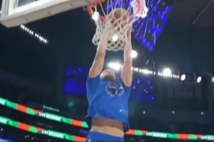赛前,库里接反弹球空接扣篮。