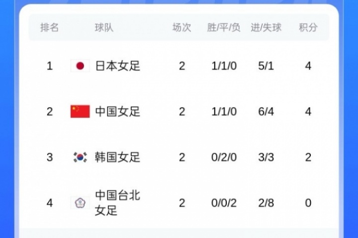 目前,中国女足与日本女足同积分4分,但因净胜球劣势,日本女足暂居第1,中国女足位列第2。韩国女足2连平第3,中国台北女足2连负位列垫底。