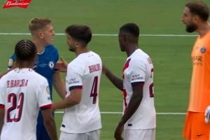 体育资讯07月14日讯 切尔西vs巴黎比赛68分钟,德拉普争位置推倒门德斯,多纳鲁马对他很生气。