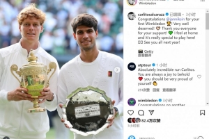 阿尔卡拉斯社媒晒出与辛纳的合照,并写道:“祝贺辛纳首次夺得温网冠军!实至名归!”