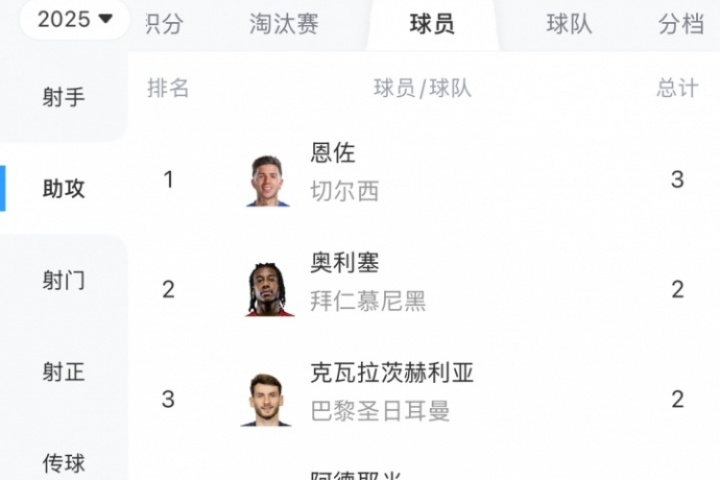 在2025世俱杯助攻榜上,切尔西中场恩佐3次助攻荣膺助攻王,奥利塞等多名球员都是2次助攻。