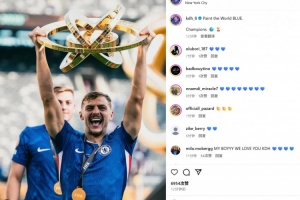 他也在赛后通过社媒晒出自己的捧杯照,并配文:“将世界染成蓝色!冠军!🌍 🏆”