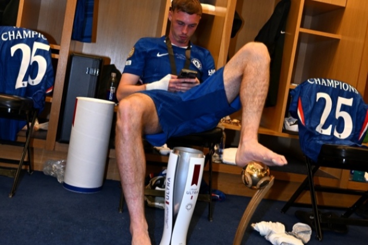 更衣室内,球员坐姿慵懒,脚踩世俱杯金球奖,胯下MVP奖杯,一如既往的“帕尔默风格”。