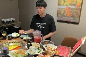 可以看到,杨瀚森的餐桌前摆放着丰盛的餐食,有牛肉、虾、毛肚、青菜等,火锅搭配烤肉。