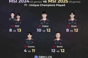 体育资讯7月15日讯 外媒统计T1队员2024 MSI与2025 MSI英雄数量对比: