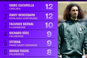 6、布鲁诺-富克斯(帕尔梅拉斯)、古斯塔沃-戈麦斯(帕尔梅拉斯)、安东(多特蒙德)、巴尔韦德(皇马)——8次